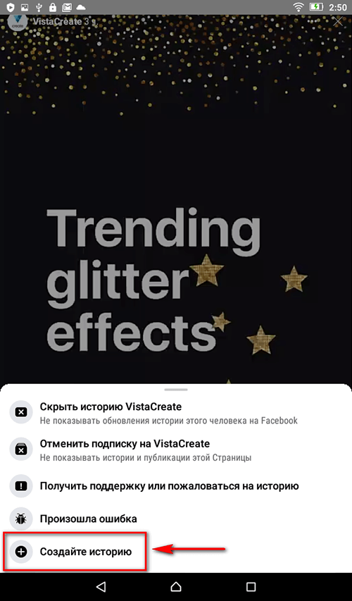 Способ #3. Открыть чужую сторис, вызвать меню (3 горизонтальных кнопки) и нажать на пункт «Создайте историю».