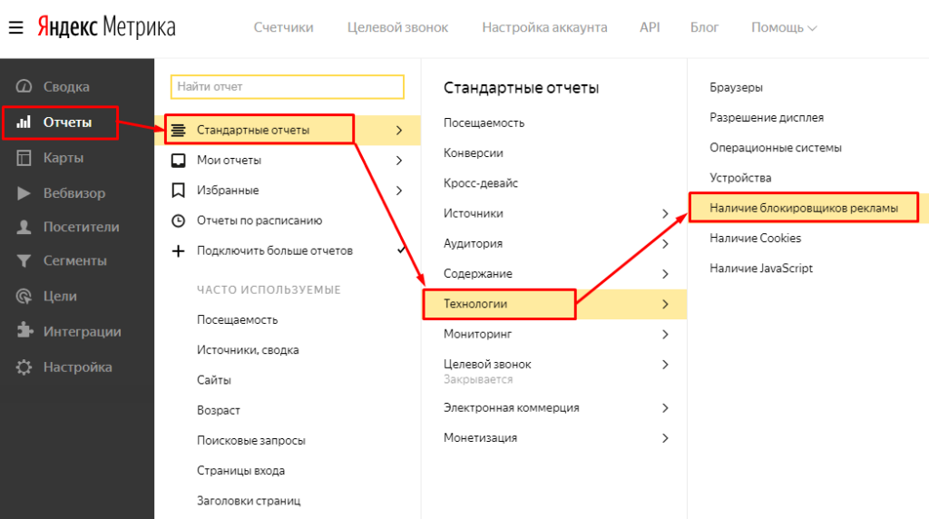 Для просмотра статистики по блокировщикам в главном левом меню выбираем «Отчеты» – «Стандартные отчеты» – «Технологии» – «Наличие блокировщиков рекламы».