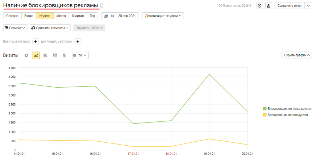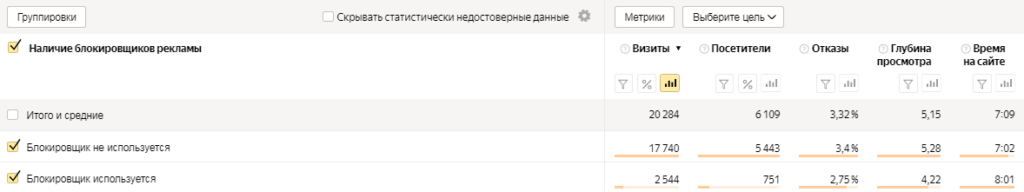 Определить, какое количество пользователей использует ПО для блокировки рекламы, можно с помощью отчета «Наличие блокировщиков рекламы» в Яндекс.Метрике. В этом отчете содержится информация о тех пользователях, которые используют самые популярные блокировщики. Сюда относятся AdBlock, AdBlock Plus, uBlock, Chostery и другие.