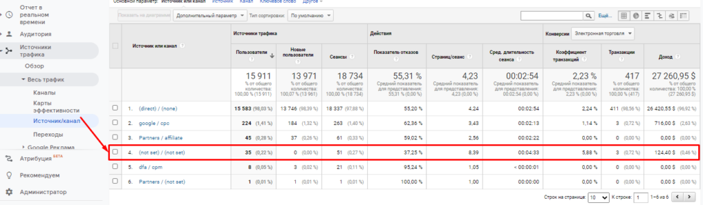 В Google Analytics нет аналогичного отчета, который бы показал, сколько пользователей применяет блокировщики рекламы. Но именно использование AdBlock и его аналогов является основной причиной того, что в отчетах по аудиториям или источникам трафика появляется надпись (not set) вместо какого-то параметра.
