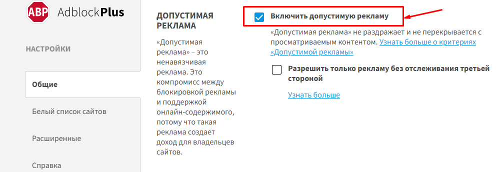 В настройках AdBlock Plus по умолчанию настроена опция «Включить допустимую рекламу». Если пользователь не отключит эту опцию, то такая реклама ему будет показываться.