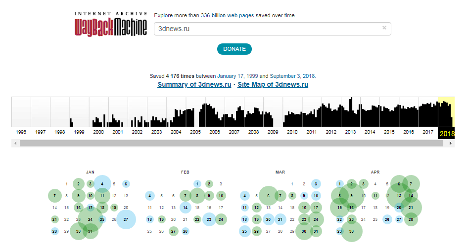 Эта своеобразная машина времени для 336 миллиардов страниц демонстрирует года активности сайтов и скрины их внешнего вида.