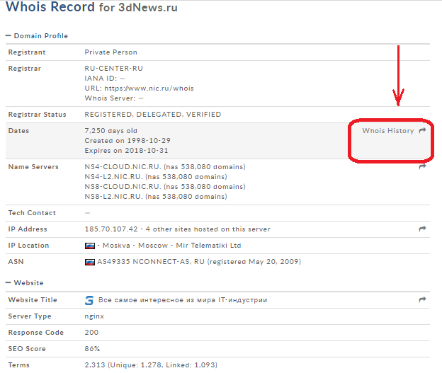 Если же вы видите множество заполненных граф – значит, название сайта имеет свою историю. Чтобы узнать детали, нажмите на стрелочку, расположенную напротив строки Dates.