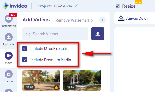 Тут важный момент — по умолчанию, в библиотеке открываются все медиафайлы: бесплатные, платные со стока iStock и премиум. Последние 2 доступны только на платных тарифах. Можно снять галочки с этих двух пунктов (Include iStock results и Include Premium Media) и выбирать среди бесплатных файлов.