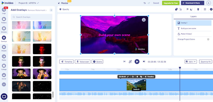 Шаг 9. В редакторе inVideo есть папка Overlays. Это анимированные эффекты, которые накладываются поверх видео. Например, можно добавить эффект Боке (блики), шумы (а-ля VHS), графические футажи (дымку, снежинки, салют), цветные эффекты. Определенно, есть из чего выбрать. Кстати, эффекты тоже можно искать по ключевым словам.