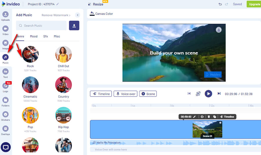 Шаг 13. Видео будет откровенно скучным без аудио. Так что нужно либо добавлять музыку, либо озвучку, либо и то и другое. Для первого есть папка Music в левой панели. С выбором проблем не возникнет — треки поделены на категории, в каждой указано количество треков. Есть и просто звуковые эффекты. Аудиодорожка размещается под видео.