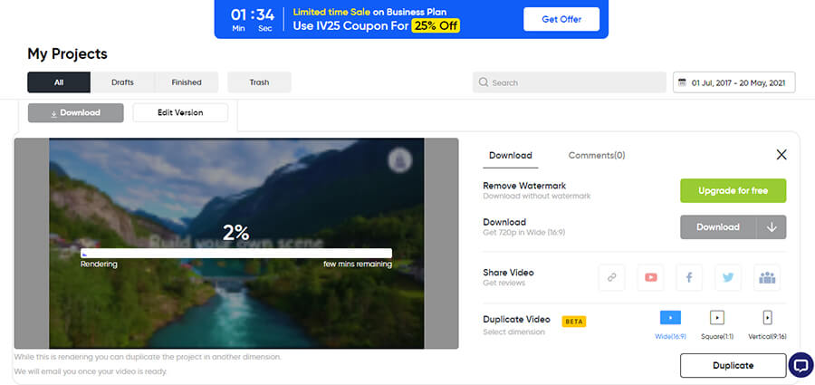 В принципе, на этом можно сохранять видео — жмем на скачивание, выбираем разрешение. На бесплатном тарифе позволяется экспортировать видео в разрешении 720 пикселей и с водяным знаком. Видео попадает в папку с проектами, где оно начинает рендериться. После рендеринга ролик можно скачать на компьютер или загрузить напрямую в соцсети.