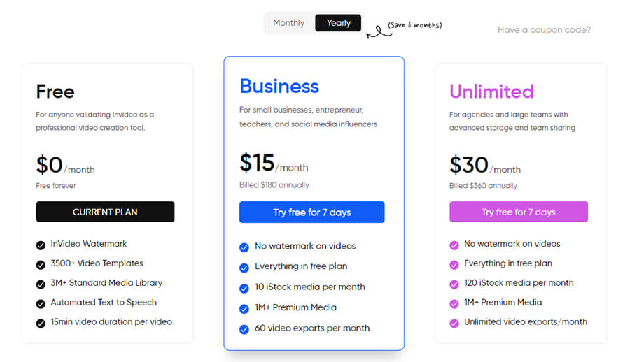 Их тут 2 — Business за 15 $ в месяц при оплате за год и Unlimited за 30 $ в месяц. Ежемесячные тарифы выходят дороже. Есть 7 дней бесплатного периода — их хватит, чтобы изучить сервис от и до. На платных тарифах нет водяного знака и можно экспортировать от 60 видео в месяц до бесконечности.