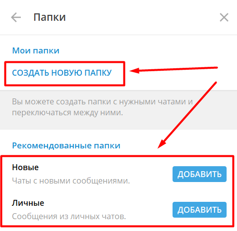 Если у вас накопилось уже больше 100 диалогов, то панель просмотра и редактирования папок появится у вас автоматически. Если же этой панели нет, то ее можно активировать в разделе параметров – нужно создать первый каталог. Сделать это очень просто.