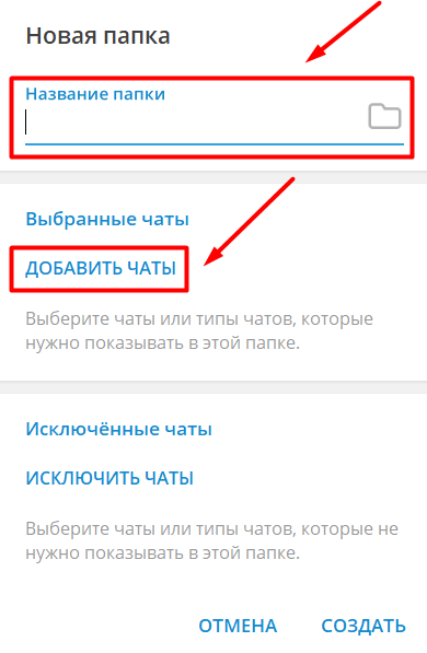 Для начала выполните долгое нажатие на кнопке “Чаты” до тех пор, пока не появится всплывающее меню с надписью “Добавить папку”. Тапните на нее. Откроется окно параметров, в котором вы сможете добавить новый каталог или отредактировать существующий.