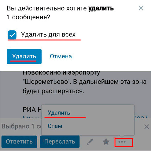 Выход прост – воспользуйтесь мобильным браузером. Действия аналогичны – выбираете блок, ставите галочку напротив «Удалить для всех» и подтверждаете намерение. Небольшая разница между десктопной и мобильной версиями – только в интерфейсе. Чтобы добраться до кнопки-ликвидатора в смартфоне, необходимо нажать на многоточие.