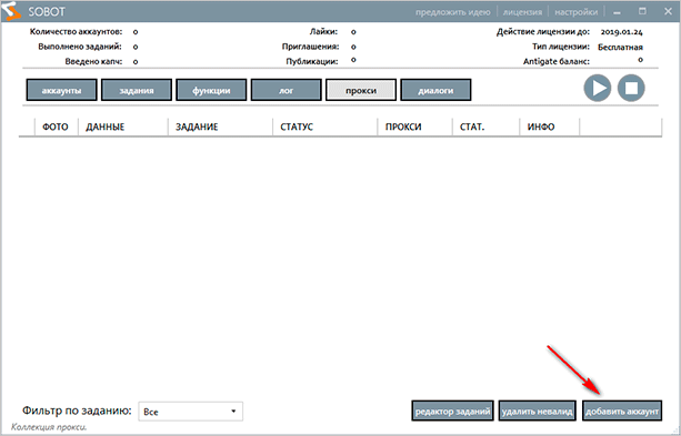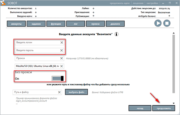 Укажите данные вашего профиля ВКонтакте. Если не используете прокси, то перетащите ползунок в положение “On”.