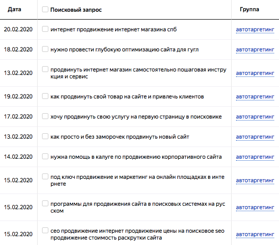 - после запуска кампании с автотаргетингом два раза в день проверяем поисковые запросы, по которым показываются объявления, и добавляем нерелевантные в список минус-слов;