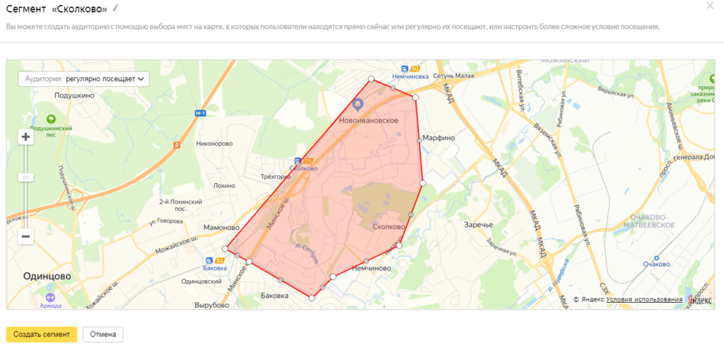 В Яндекс.Аудиториях вы можете выделить все нужные вам локации с помощью инструментов Полигон или Окружность, затем задать критерий «Регулярно бывают». В итоге у вас получится сегмент пользователей, которые посещали эту локацию за последние 45 дней.