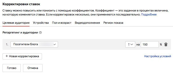 Для таких аудиторий можно задать повышающую корректировку — это логично, так как пользователи, которые уже соприкасались с вашим брендом, потенциально находятся ближе к нижним уровням воронки, чем те, которые видят вашу рекламу впервые.