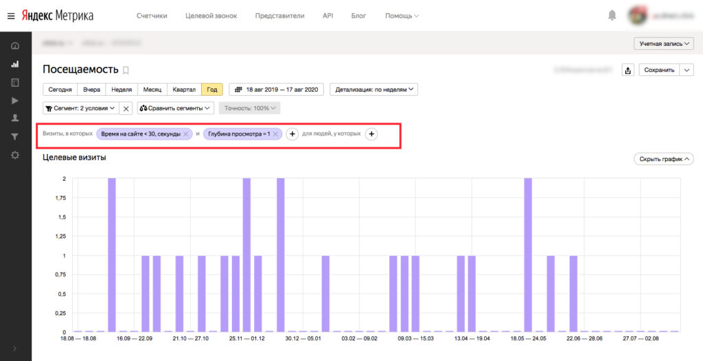 Например, из отчетов Метрики мы поняли, что пользователи, которые просматривают на сайте всего одну страницу и находятся на ней менее 30 секунд, абсолютно нецелевые для нас.