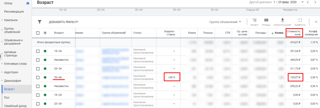 Для эффективных сегментов повышаем корректировки. Например, при анализе данных системы аналитики мы выяснили, что самые дешевые конверсии приносят пользователи в возрасте 35-44 лет. Для этого сегмента устанавливаем повышающую корректировку: