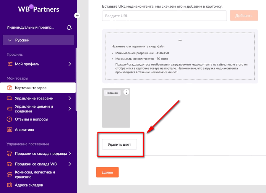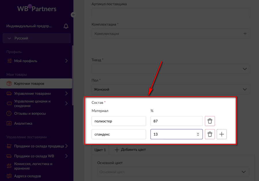 Если это не сделать, под каждый цвет и размер будет создана отдельная карточка. И, скорее всего, все эти карточки в итоге не пропустят, а укажут вам на необходимость прописать отдельные артикулы для каждого цвета и размера, но с общим артикулом поставщика, чтобы система могла их объединить.