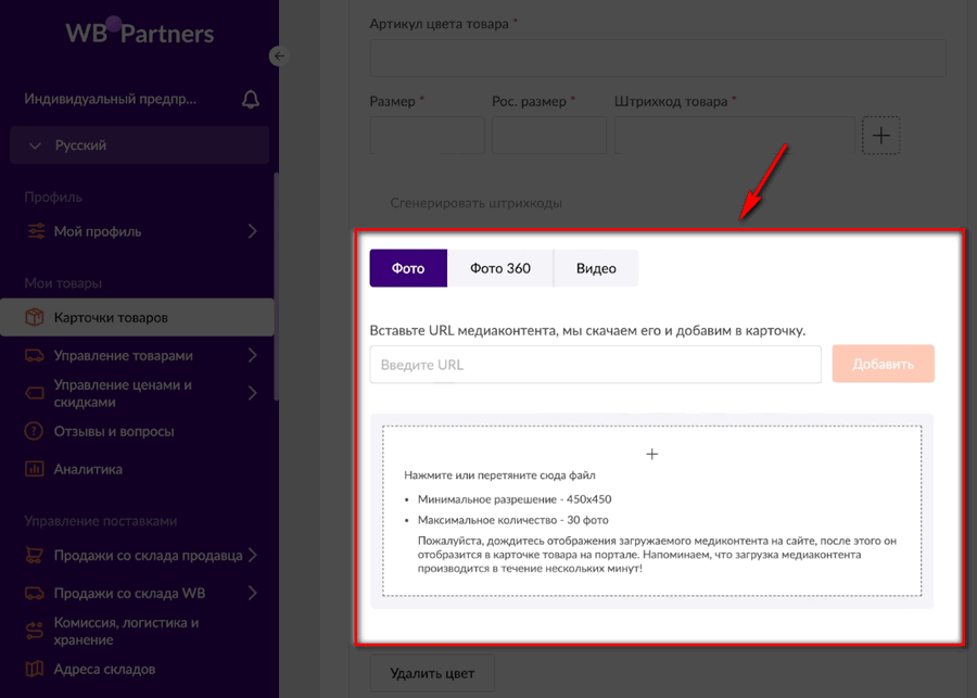 Шаг 13. Загружаем медиаконтент. Это фото, панорамное фото 360 или видео. У товара должно быть, как минимум, одно фото. Его можно загрузить с компьютера или добавить ссылкой.