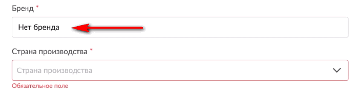 Первое, что заполняем — бренд. Здесь пишем название бренда только если у вас есть зарегистрированная товарная марка либо документы, позволяющие продавать товар чужого бренда.