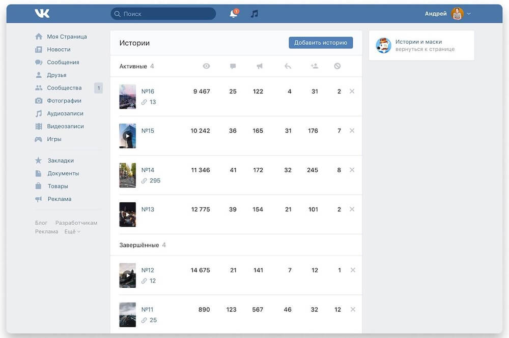 В веб-версии можно посмотреть статистику по всем историям сообщества на на вкладке управления, либо нажав на иконку в виде глаза в самой истории.