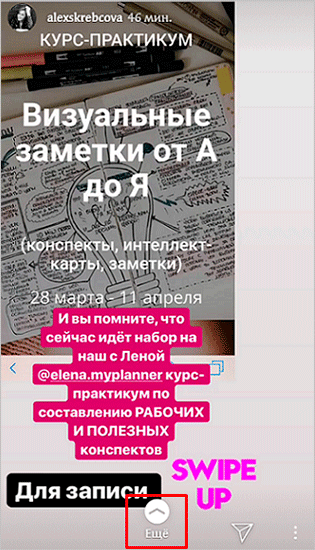 Вокруг значка ссылки появился белый фон, это значит, что она успешно добавлена к изображению или видео. После этого можно сохранить Историю и посмотреть, что получилось. Внизу экрана будет слово “Еще” со стрелочкой. На телефоне это выглядит так.