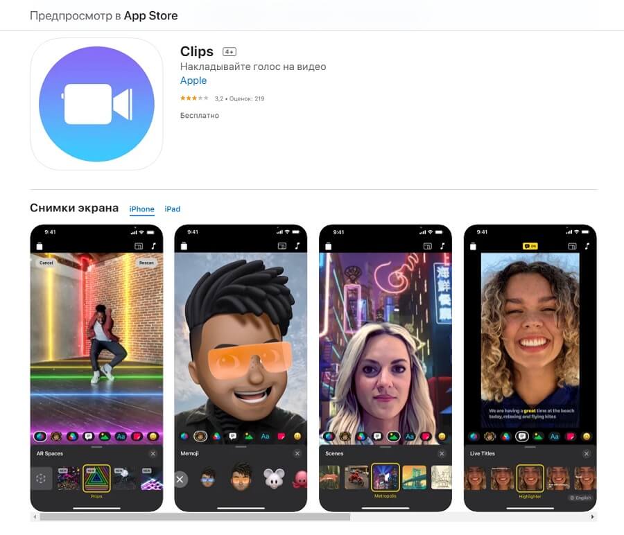 Clips — это мобильный редактор, созданный Apple. Выпущен еще в 2017 году, но продолжает пользоваться популярностью. Идеален для создания субтитров, так как автоматически генерирует анимированные титры на основе речи спикера. Они отображаются на экране синхронно с голосом пользователя под ритм его речи. То есть, не нужно специально анимировать текст или устанавливать его длительность. Кроме добавления субтитров в приложении есть эффекты, стикеры, эмодзи, музыка. Также в Clips можно найти эффекты дополненной реальности. Есть возможность снимать селфи-сцены внутри 360‑градусных видеопанорам. Для использования последней версии приложения требуется iOS 14.5 или более новая.
