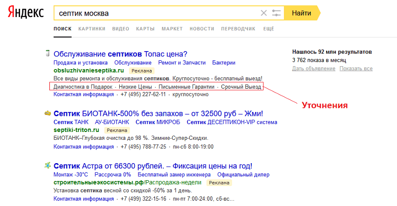Для наглядности обратимся к примеру, который поможет понять, что такое уточнения в Яндекс Директ и как они выглядят. Для этого достаточно вбить любой запрос в поиск Яндекса. Например, вводим [септик Москва] и получаем вот такой результат.