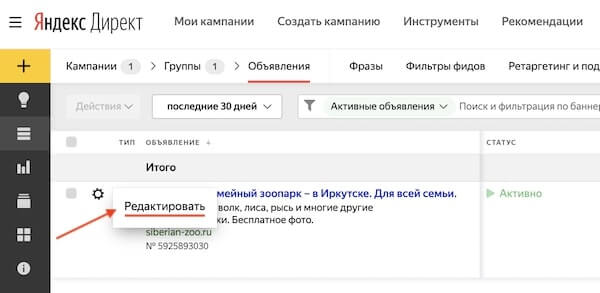 Шаг 1. Заходим в свою рекламную кампанию и нажимаем «Редактировать» на любом объявлении.