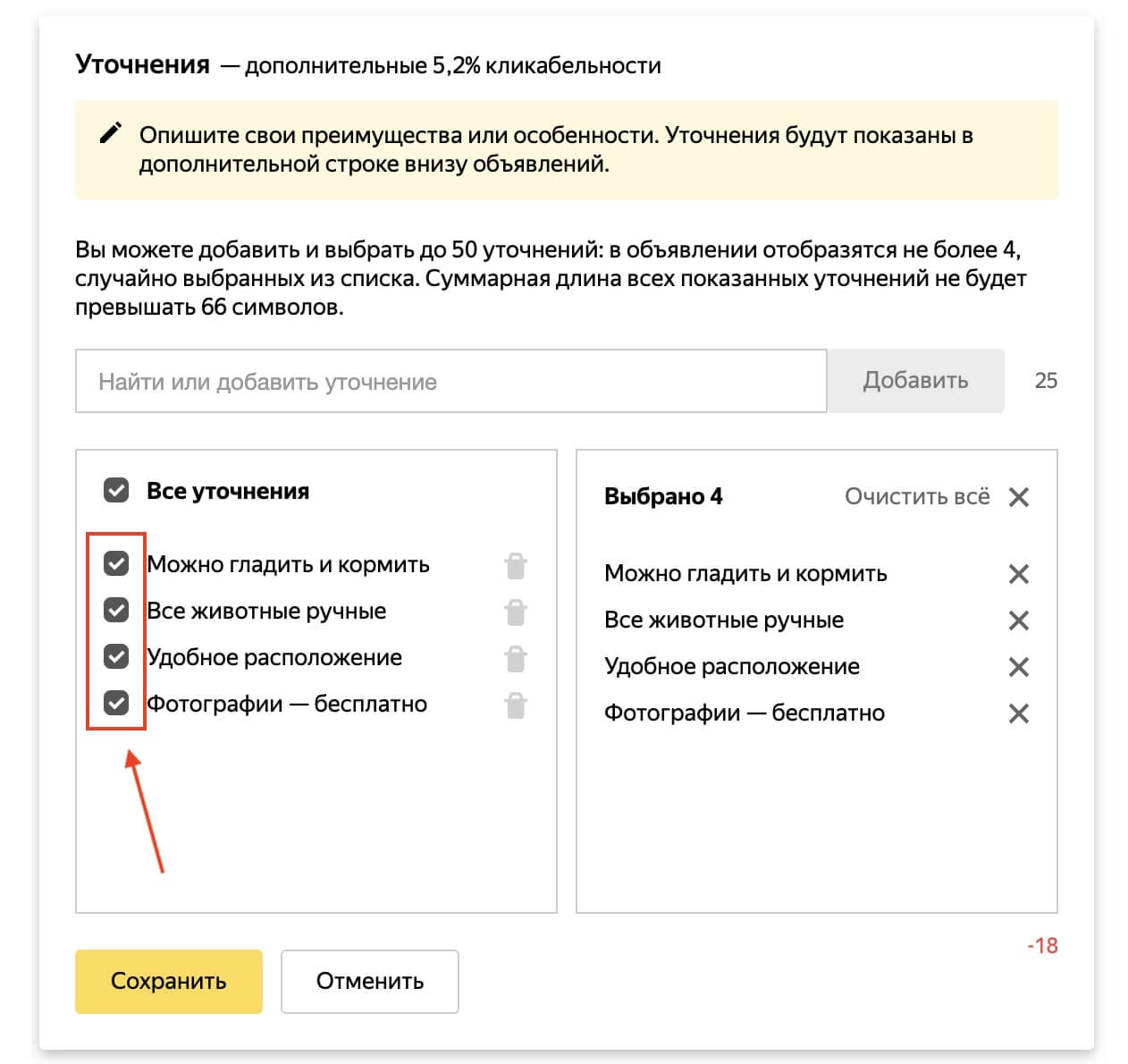 Можно добавить и выбрать до 50 уточнений: в объявлении отобразятся не более 4, случайно выбранных из списка. Общая длина всех показанных уточнений не должна превышать 66 символов. Максимальная длина одного уточнения — 25 символов.