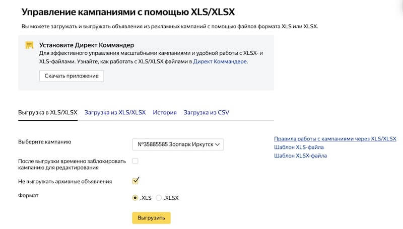 Например, если вы хотите добавить уточнения для всех объявлений в уже работающей рекламной кампании, то перейдите на страницу управления с помощью Excel. Скачайте файл в нужном формате.