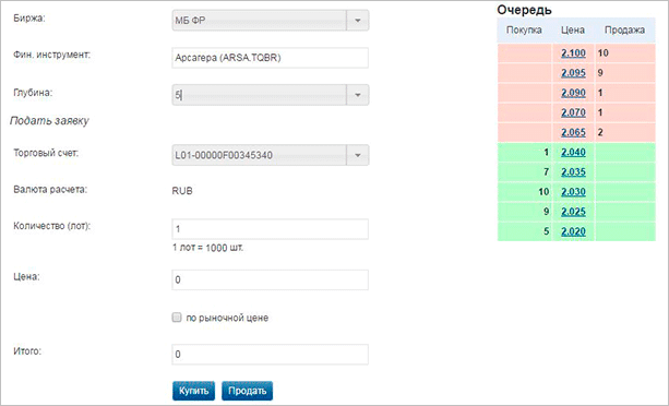 - Рыночной цене. Например, на рисунке выше при заявке по рыночной цене мы купим по последней цене продавца, т. е. за 2,065 руб., а продадим за 2,04 руб. Это не сыграет особой роли, если сделка на маленькое количество лотов, но при больших объемах каждая копейка на счету.