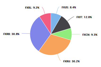 - акции международного рынка (FXUS, FXIT, FXCN, FXDE) – 30 %;