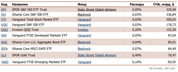 Получился ETF Vanguard S&P 500 (тикер VOO), который на сегодня занимает 4-ю строчку в мире самых крупных ETF по стоимости чистых активов.