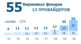 ETF – индексный биржевой фонд, акции которого торгуются на бирже. В мире насчитывается таких уже более 7,5 тыс. штук, в России – только 16 на конец 2020 г.