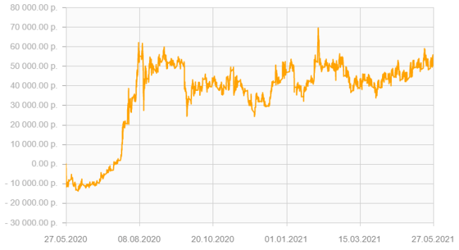 Через год ваш счет увеличился на 52 689,99 руб. (52,69 %). Ваши вложения попали на период, когда инвесторы старались обезопасить свой капитал и вкладывали его в драгоценные металлы на фоне пандемии и локдаунов по всему миру.