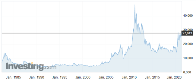 Только за 2020 год серебро выросло в цене на 47,8 %, тогда как за 22 года (с 1982 по 2004 г.) цена практически не менялась.