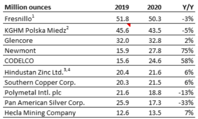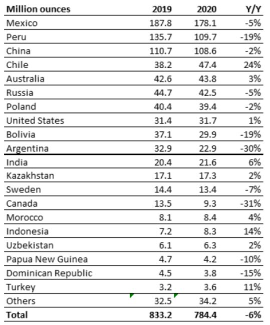 В 2020 г. мировая добыча полезных ископаемых продемонстрировала четвертый ежегодный спад подряд. Он самый значительный за последнее десятилетие – на 5,9 %, т. е. до 784,4 млн унций. Производство первичных серебряных рудников упало на 11,9 % до 209,4 млн унций, что вызвано временным закрытием рудников в нескольких основных странах-производителях в первой половине 2020 г. из-за пандемии.