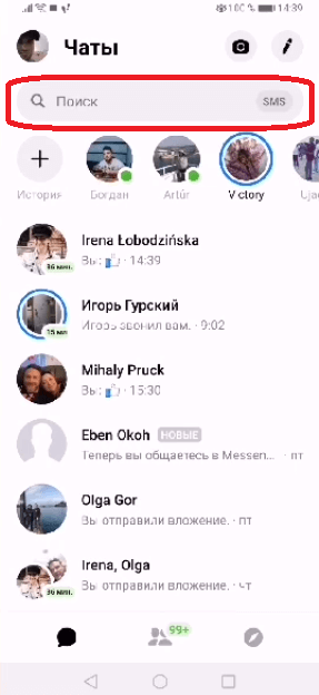 Приложение поддерживает возможность просмотра чужих Историй из «Фейсбук» и публикацию своих Stories. Есть поиск по чатам, функция «Кто сейчас онлайн».