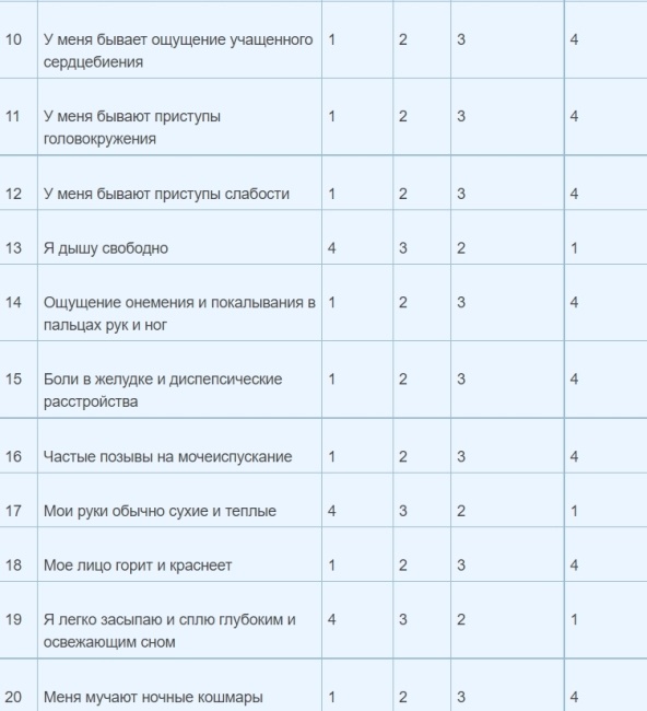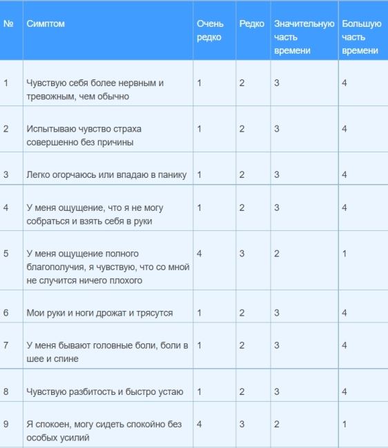 Расскажу, как это работает. Вам нужно поочередно читать симптомы и отмечать для себя, насколько часто или редко вы их ощущаете (по шкале от “очень редко” до “большую часть времени”). Каждой позиции соответствует определенное количество баллов. Вам нужно ответить на все вопросы и суммировать баллы. Внизу под таблицей мы напишем результаты.
