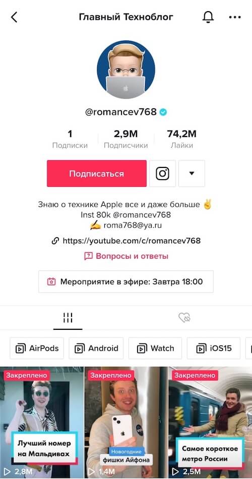 Качественная картинка на аве, запоминающееся название ник, ссылки на Инстаграм и Ютуб, обложки с заголовками роликов в ленте, включены вопросы и есть анонс ближайшего эфира.