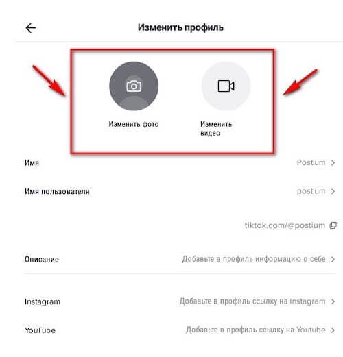 Чтобы поменять аватарку, заходим в «Изменить профиль». Затем выбираем «Изменить фото» или «Изменить видео».