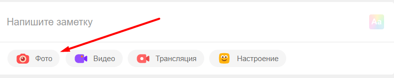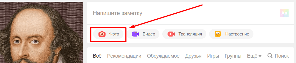 Первая страница, на которую попадает пользователь после авторизации на ok.ru, – это лента новостей. Так вот, можно прямо из ленты добавить новые материалы к себе в фотораздел. Для этого есть уже знакомая нам кнопка “Фото” в блоке создания новой заметки. Алгоритм действий тот же: кликаете на нее и выбираете на компьютере нужные файлы.
