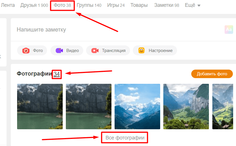 А еще на вашей страничке есть целых три ссылки, по которым можно перейти в фотораздел. Отметил их на скриншоте ниже.