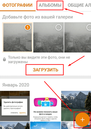В правом нижнем углу есть кнопка со знаком “+”. После нажатия на нее вы опять же попадете в галерею телефона и сможете выбрать файлы. А вот для того, чтобы выбрать место, в которое вы хотите поместить изображения, нужно будет перейти на вкладку “Альбомы”.
