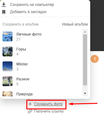 Кроме публикации личных фотографий, вы вправе сохранять к себе любые картинки из интернета или из социальной сети. Для этого откройте понравившееся изображение и нажмите “Сохранить фото”. Откроется окошко со списком ваших фотоальбомов. Выберите тот, в который хотите скопировать картинку.