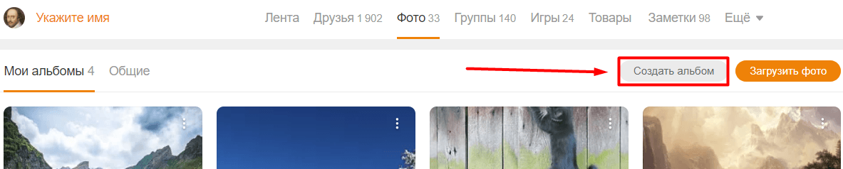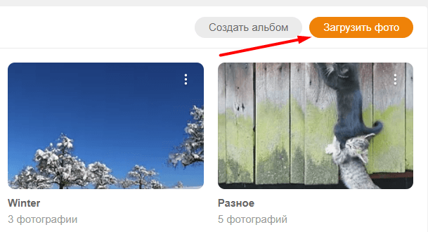 Фотоснимки с компьютера не обязательно сразу помещать в существующий фотоальбом или создавать новый. Их можно скинуть прямо в фотораздел. Для этого нужно использовать кнопку “Загрузить фото” или мышкой перенести файлы из проводника прямо в окно Одноклассников. При этом изображения будут автоматически помещены в место под названием “Мои фото”.