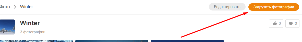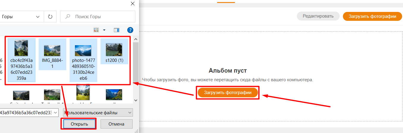 Вы окажетесь в окне созданного альбома. Нажмите “Загрузить фотографии”. Откроется стандартное окно Windows (или macOS), в котором нужно будет выбрать файлы, после чего кликнуть “Открыть”.