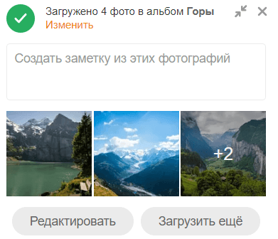Когда снимки будут загружены, вы увидите их на странице. Плюс появится небольшое всплывающее окошко с уведомлением о том, что процесс удачно завершился.