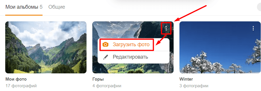 Поместить снимки в фотоальбом, который был создан заранее, можно прямо из фотораздела. Кликните на три вертикальные точки в правом верхнем углу миниатюры альбома. Выпадет меню, в котором следует выбрать пункт “Загрузить фото”. После этого появится окно проводника. Вам останется только найти нужные картинки и нажать “Открыть”.